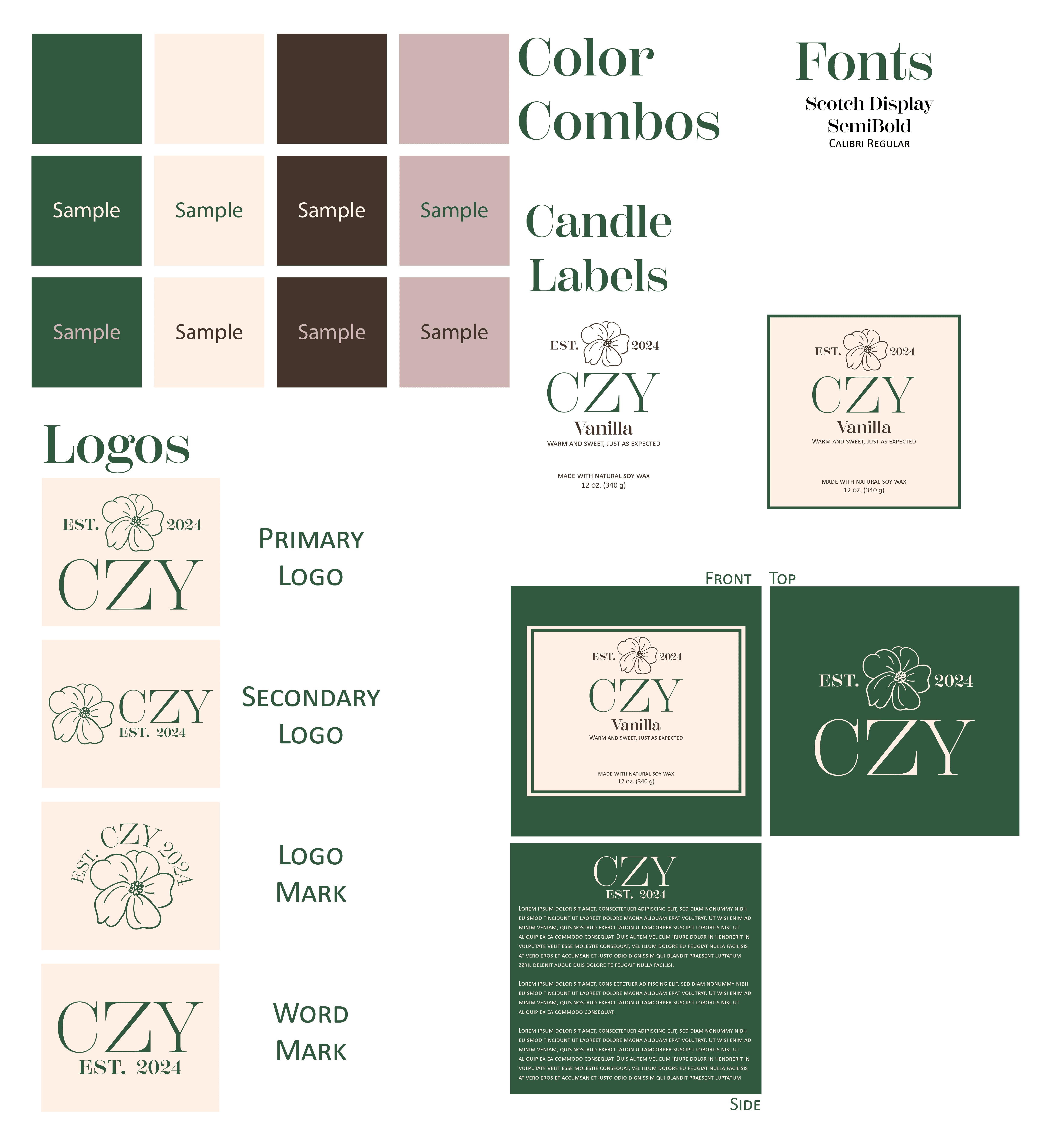 CZY is a candle brand that is all about creating luxurious, handcrafted scented candles that evoke a sense of warmth, comfort, and calm in any space. Their brand focuses on simplicity, elegance, and natural elements, and they want that to shine through in their brand identity.